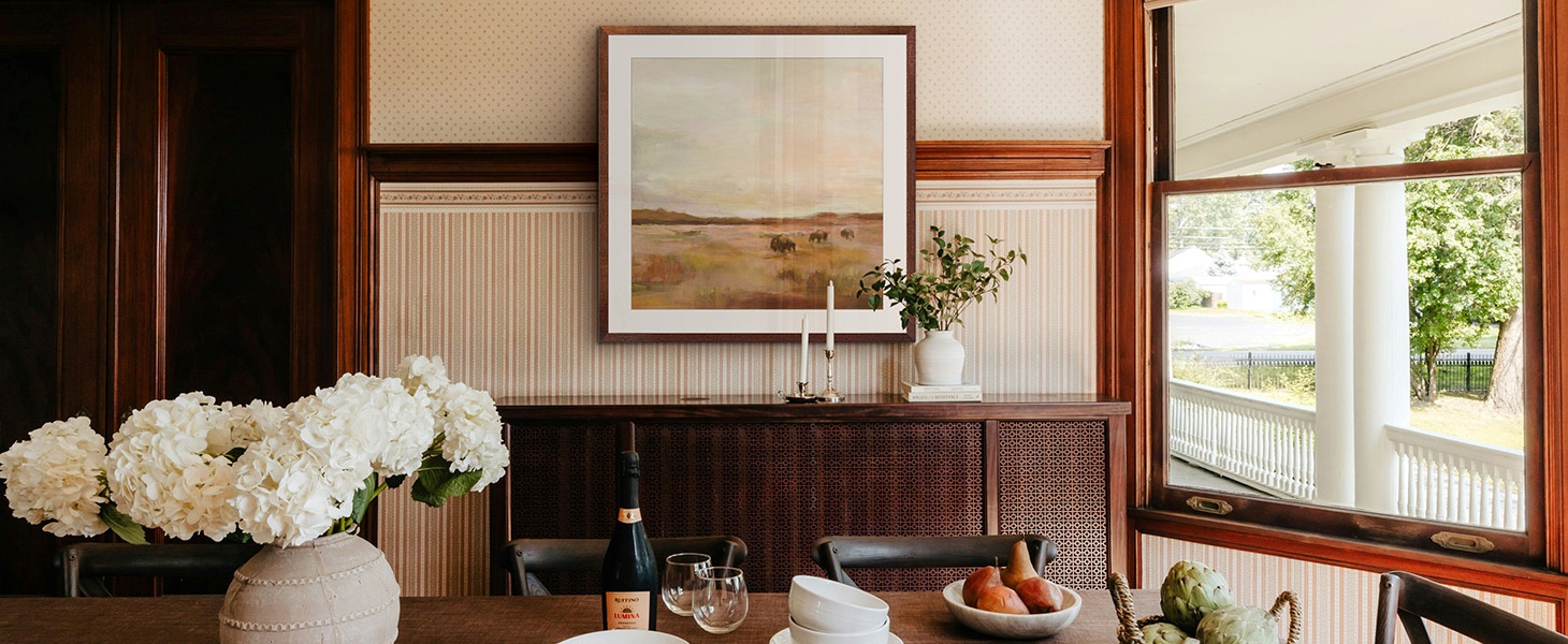 This new Americana trend embraces abstracts featuring warm brown hues, rustic imagery, and bucolic landscapes. Go off-grid and decorate your home with this style that embraces nature and authenticity.