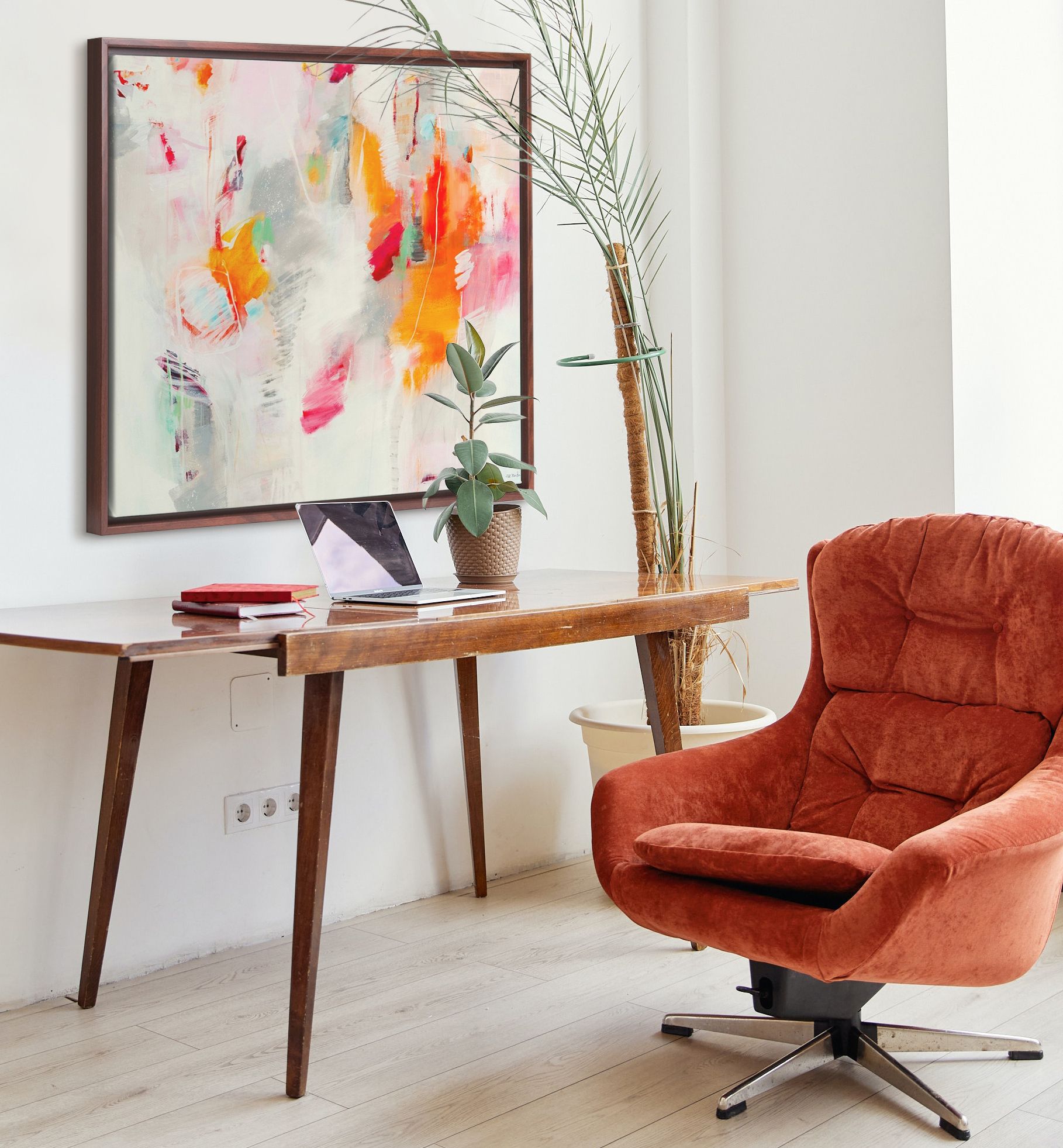 Although the bold and punchy citrus colors are starting to show up everywhere, from your favorite celebrity's remodel to the designer runway, there is an opportunity to introduce this trend in a subdued manner. This soft and easy abstract, Melon and Matcha I by Victoria Barnes has energy and whimsy that encompasses this bright color trend beautifully. Touches of orange, lime, grapefruit, and even the hue of deep blood orange make this piece a perfect art accessory for any room or space.