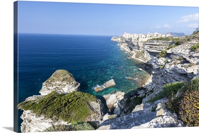Sun shines on the white limestone cliffs framed by the sea, Bonifacio, Corsica, France