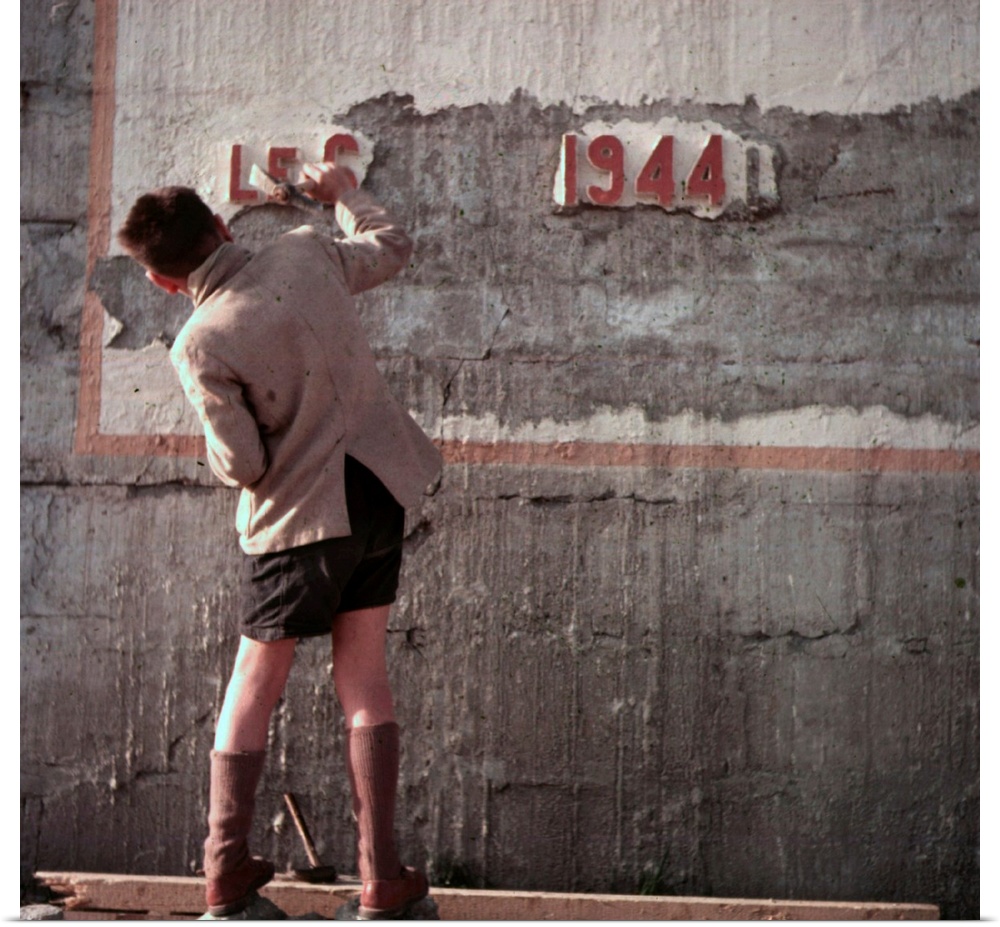 <p>Bomb damage caused during World War II is still visible in the French town of Amiens ten years later The boy is trying to rescue some of the figures from the French Liberation Memorial Plaque as a souvenir, before the remnant of Hitler's Atlantic Wall in</p>