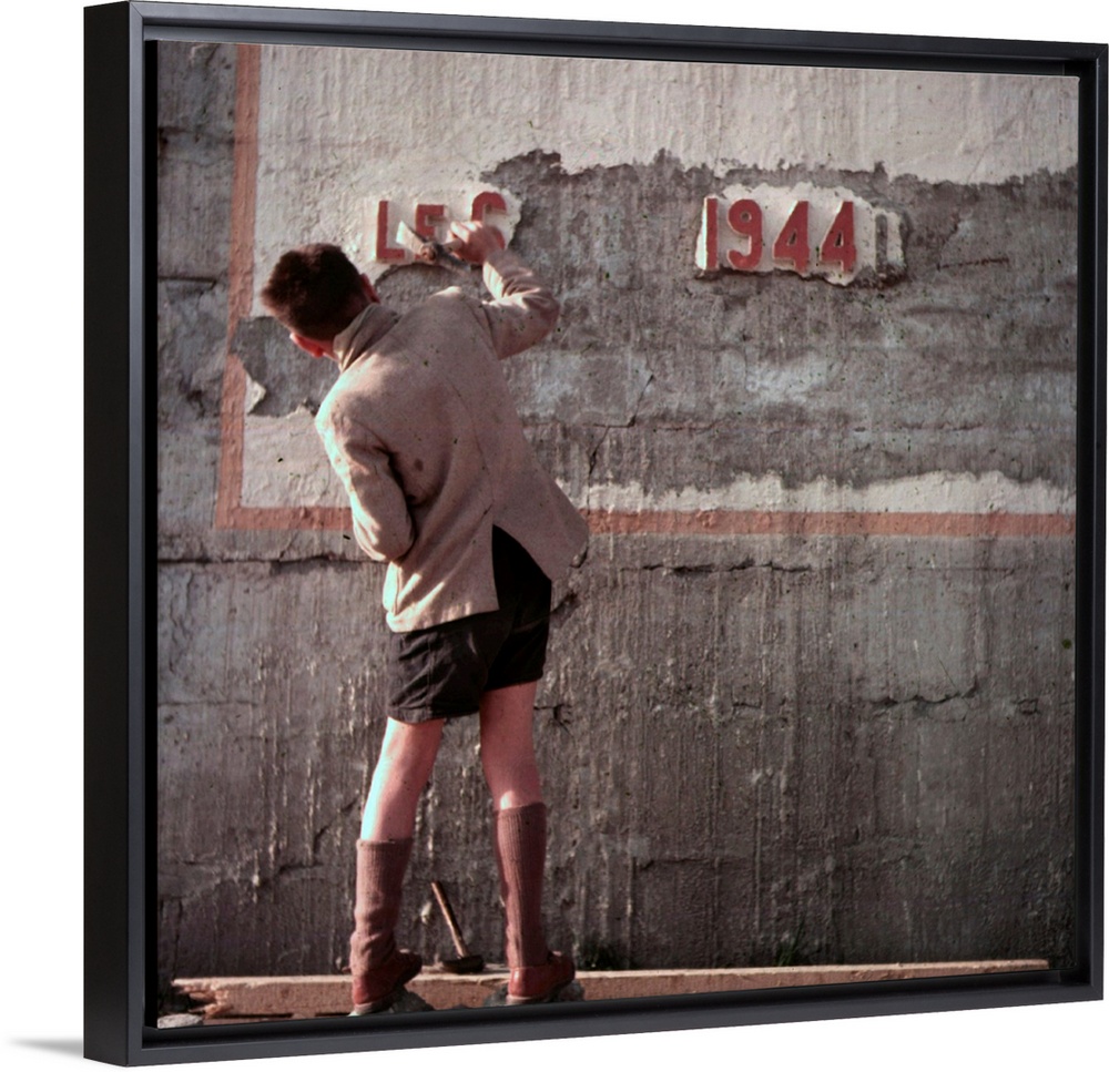 <p>Bomb damage caused during World War II is still visible in the French town of Amiens ten years later The boy is trying to rescue some of the figures from the French Liberation Memorial Plaque as a souvenir, before the remnant of Hitler's Atlantic Wall in</p>
