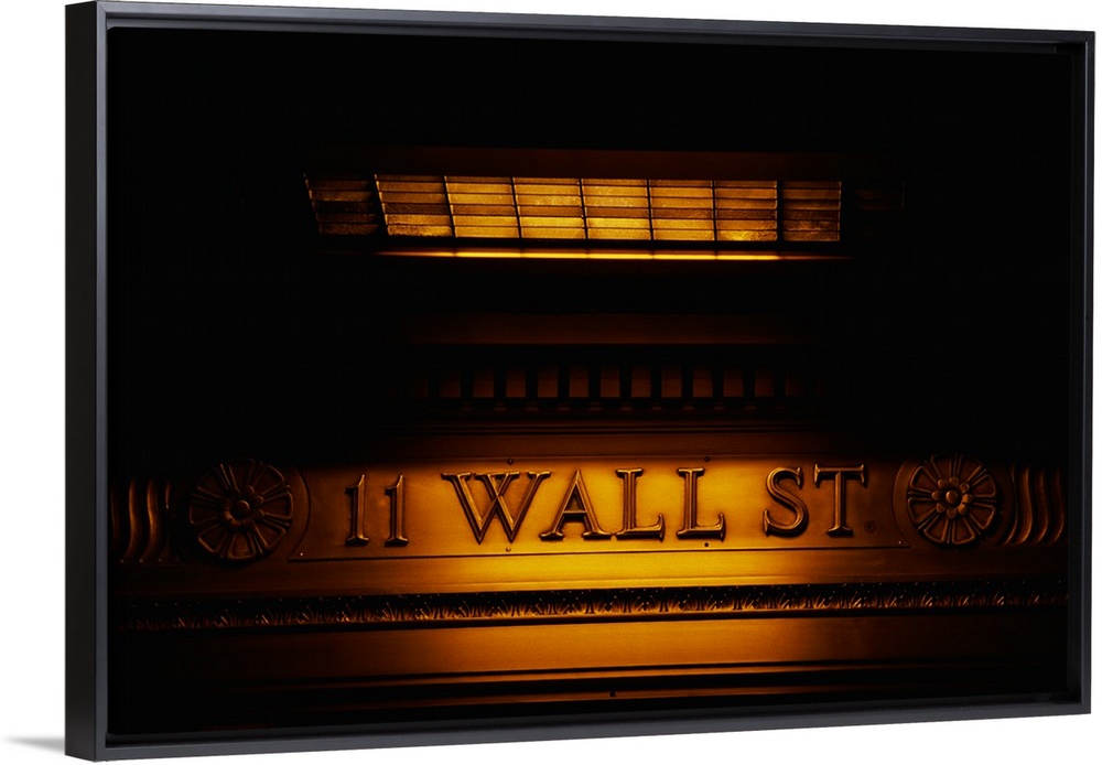 <p>Large canvas photo of an engraved financial district sign that is dimly lit around its edges.</p>