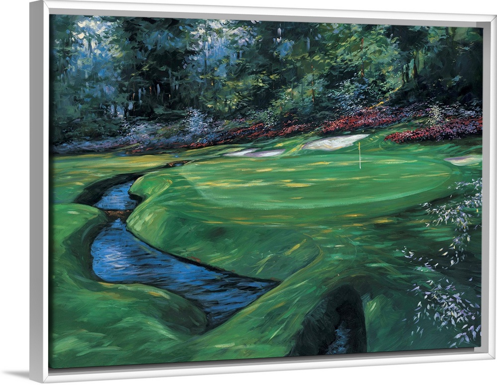 <p>A traditional style painting of the thirteenth green of Augusta National Golf Club in Georgia, home of the Masters Golf Tournament. The light suggests it is late afternoon, with dappled sunlight falling across the grass, and a bank of spring flowers in the background.</p>