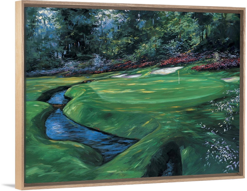 <p>A traditional style painting of the thirteenth green of Augusta National Golf Club in Georgia, home of the Masters Golf Tournament. The light suggests it is late afternoon, with dappled sunlight falling across the grass, and a bank of spring flowers in the background.</p>