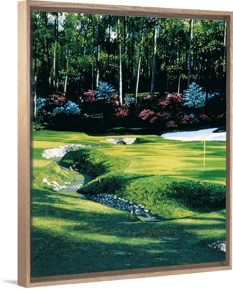 <p>Lifelike painting of stream crossing through a golf course, past the flag towards the forested edge and a tiny stone bridge.</p>