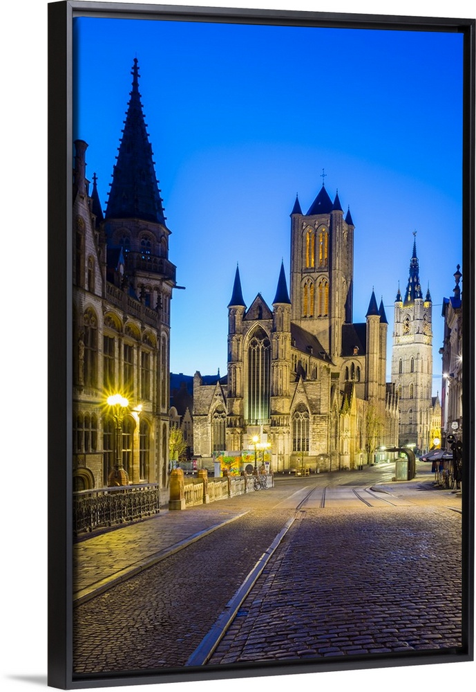 <p>Belgium, Flanders, Ghent (Gent). Sint-Niklaaskerk (Saint Nicholas' Church) and Het Belfort van Gent, 14th century belfry, at night from St. Michael's Bridge.</p>
