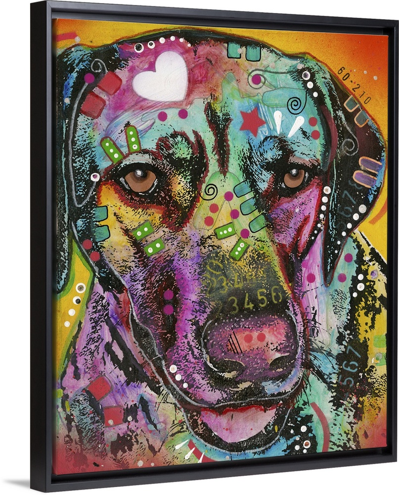 <p>Contemporary painting of a colorful Labrador with geometric abstract designs all over.</p>