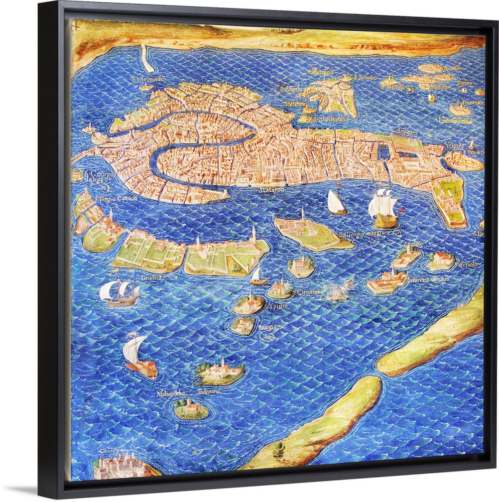 <p>16th century map of Venice showing the lagoon. Venice is a coastal city in the north-east of Italy. The main bulk of Venice is in the upper frame of the image and the large canal at the left is the Grand Canal. The Gallery of Maps in the Vatican Museums holds maps which were commissioned between 1578 and 1580 to show the regions of Italy and territories of the church. The maps are based on the work of Ignazio Danti, a 16th century Italian priest, mathematician, astronomer and cosmographer, and are an important record of 16th century geography. Here the many islands on which Venice is built can be seen.</p>