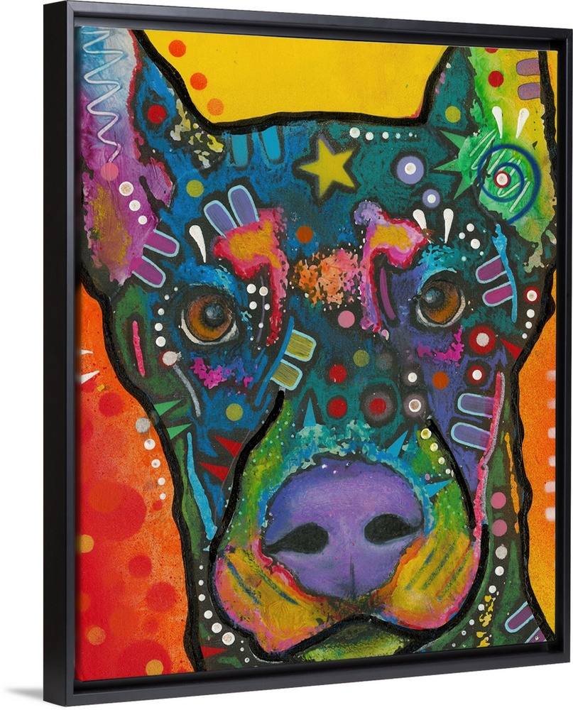 <p>Colorful painting of a dog with geometric abstract markings.</p>