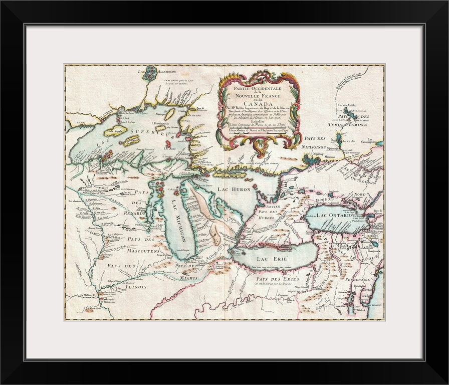 <p>1755 map of the Great Lakes region entitled Partie Occidentale de la Nouvelle France ou du Canada, by M. Bellim, mapmaker to the king, hand-colored engraving, private collection.</p>