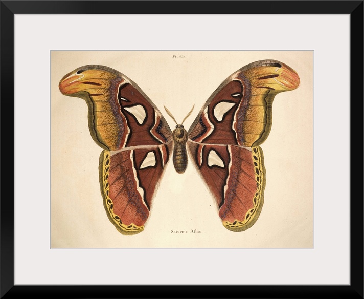 <p>Copperplate print with contemporary hand colouring from Betruch's \Bilderbuch fur kinder\. It shows the worlds largest moth (wing area), the Atlas moth. The dark colouring indicates this may be Edward's Atlas moth Attacus atlas edwarsii (Archeaoattacus edwarsii), and the accuracy suggests it was drawn and painted directly from a specimen. The moth is also famous for the incipient occeli on the hooked wing tips which, with the other markings on the wing tip, begin to resemble the head of a snake.</p>