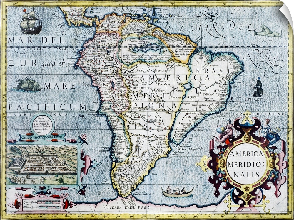 <p>South America, 17th century Dutch map. This shows the new continent that was being discovered by European explorers. The shape is distorted because it had not yet been accurately mapped. Two large rivers in Brazil are shown flowing from a large lake in eastern Brazil. The western coastline is by now fairly accurately mapped, but it was still not realised that Tierra del Fuego (bottom centre) in the Straits of Magellan, was a group of islands and not part of a large southern continent. The inset at lower left shows the Incan city of Cuzco in Peru. This map, published around 1630 by Jodocus Hondius, continued the earlier work of Gerard Mercator.</p>