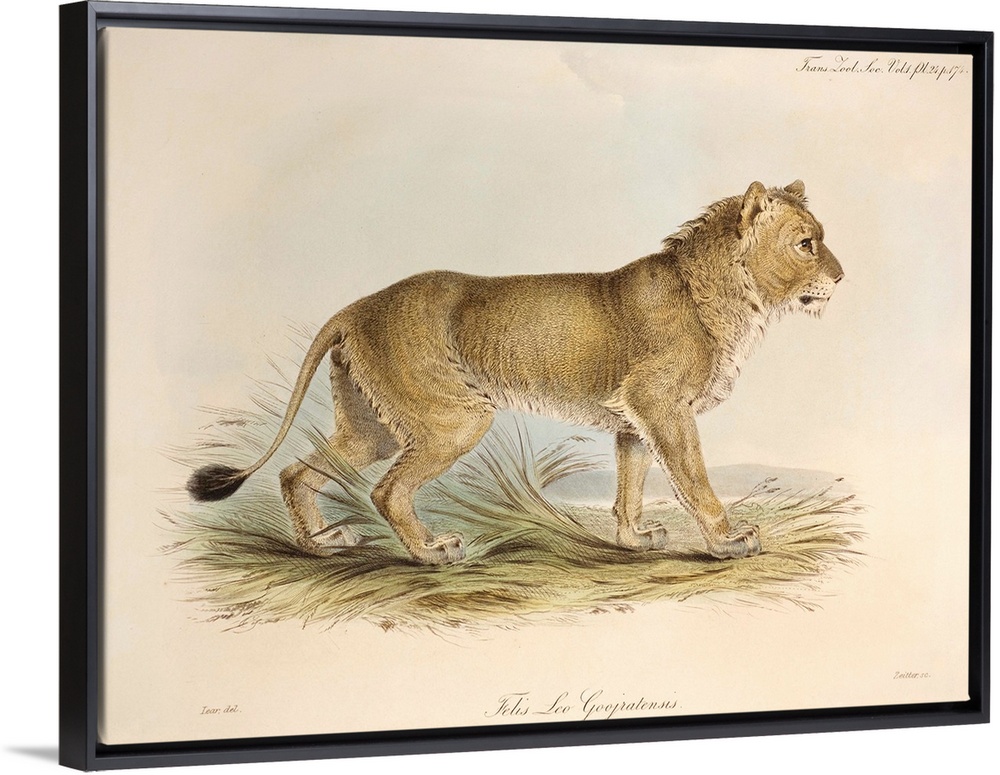 <p>Plate 24 from Volume 1 Trans. Zool. Soc. London, 1835, \Some Account of the maneless Lion of Guzerat\ with contemporary hand colouring as issued. The plate illustrates the first scientific confirmation, with a specimen, of the maneless Indian lion. It was communicated to the Zoological Society of London by Captain Walter Smee 1833. This plate was engraved by Zeitler from a painting by Edward Lear (1812-1888) who went on to be more famous for his 'literary nonsense' poems. He was however a talented painter employed early in his career by the Zoological Society. In the accompanying article, Captain Smee writes of the lion \there exists a race in which the king of beasts is destitute of the flowing mane which constitutes the most remarkable of his regal ornaments\.</p>
