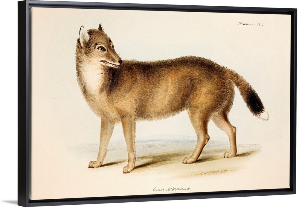 <p>The extinct Falkland Island Wolf or Fox. Hand coloured lithograph, Plate IV, The Zoology of the Voyage of H.M.S. Beagle, edited and superintended by Charles Darwin. Part II Mammalia by George Waterhouse (1839). In the text accompanying this image Darwin notes that the population on East and West Falklands appeared to differ - presaging</p>