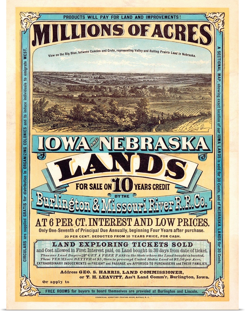 <p>The poster notes Millions of acres. Iowa and Nebraska. Land for sale on 10 years credit by the Burlington & Missouri River R. R. Co. at 6 per ct interest and low prices. Printed in Buffalo, New York by the Burlington & Missouri River Railroad Company. Private collection.</p>