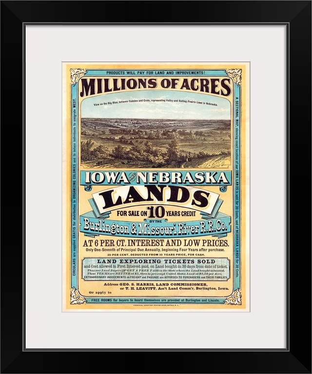 <p>The poster notes Millions of acres. Iowa and Nebraska. Land for sale on 10 years credit by the Burlington & Missouri River R. R. Co. at 6 per ct interest and low prices. Printed in Buffalo, New York by the Burlington & Missouri River Railroad Company. Private collection.</p>