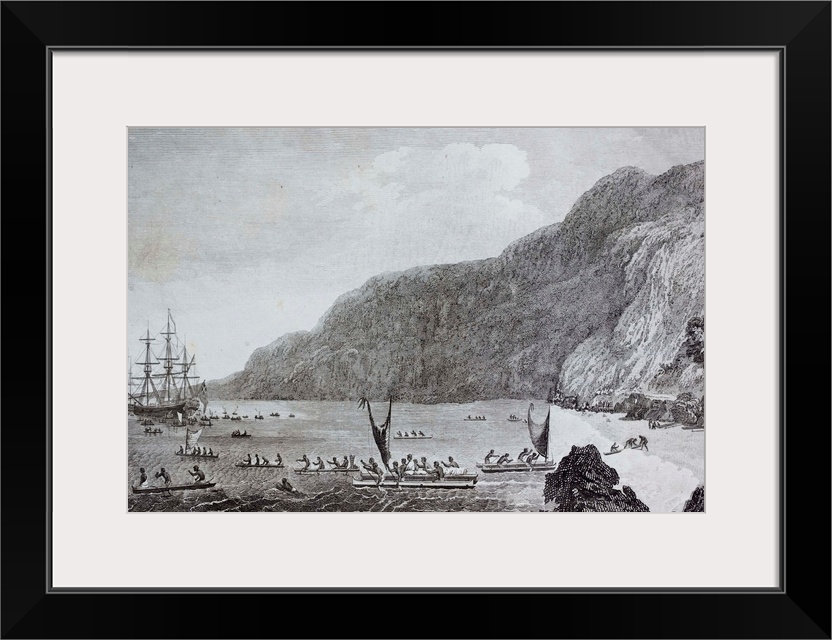 <p>The engraving shows a ship, possibly HMS Resolution and native Hawaiians in canoes.</p>
