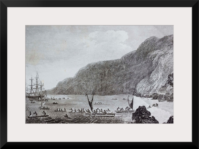 <p>The engraving shows a ship, possibly HMS Resolution and native Hawaiians in canoes.</p>