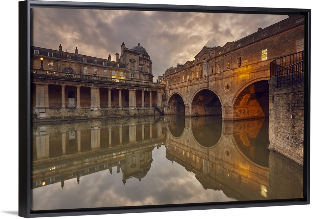 <p>A dusk view of the unique 18th century Pulteney Bridge spanning the River Avon, in the heart of Bath, UNESCO World Heritage Site, Somerset, England, United Kingdom, Europe</p>