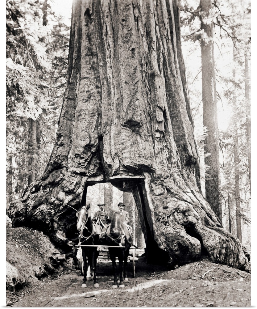 <p>1900s two men driving buggy drawn by two horses through tunnel arch cut through base trunk of giant sequoia tree California, USA.</p>