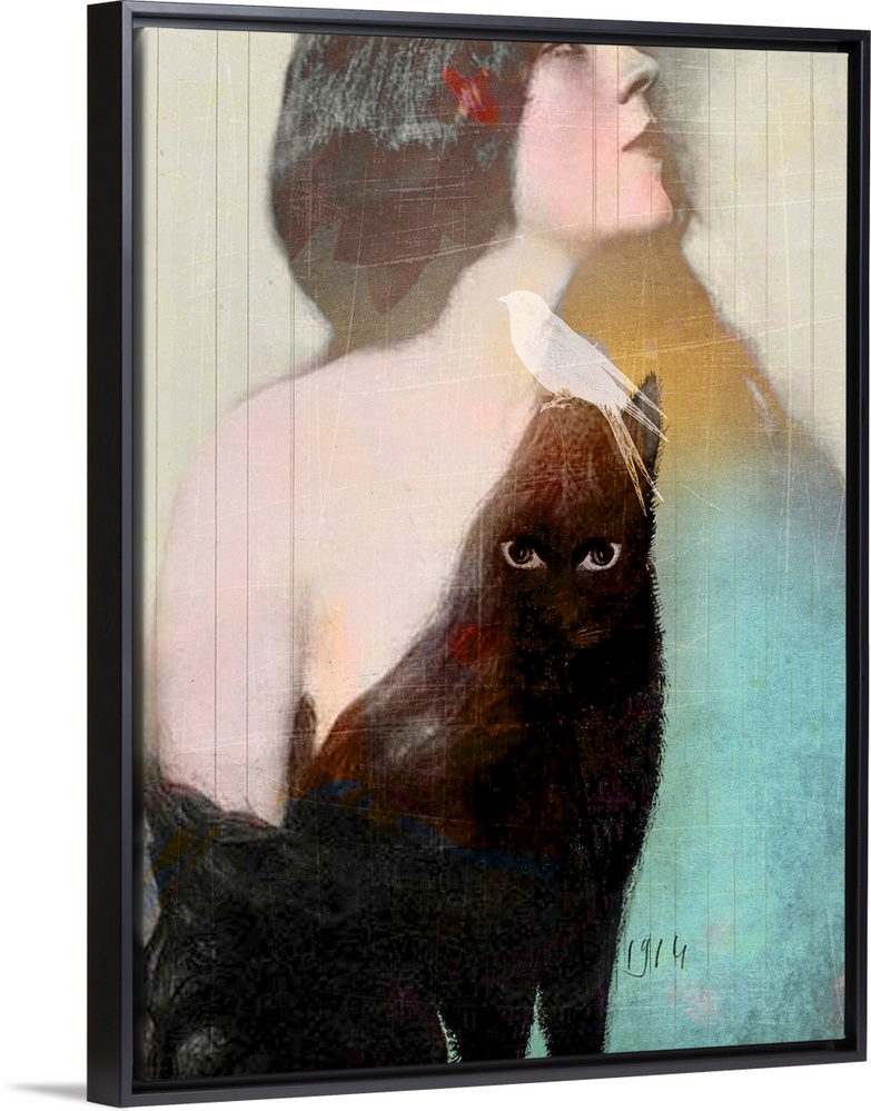<p>A composite image of a woman with long black hair and a black cat with a white bird on it's head.</p>