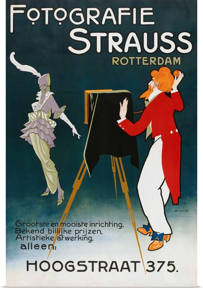 <p>1914 poster advertising Fotografie Strauss in Rotterdam, Netherlands, by Dutch artist Arnold van Roessel, 1883-1947</p>