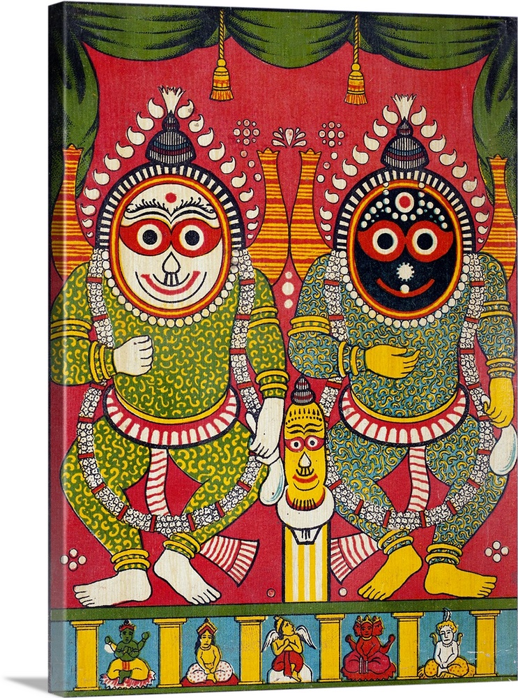 <p>1920. A vivid Jagganath (Lord of the Universe) trio chromolithograph by Ravi Varna. From left to right, Baladeva, Subhadra and Lord Jagganath, in Puri Dhama. The Jagganath trio (of Puri) stands out from the other classical hindu deities in terms of their radical stylisation. It is thought that the images may owe much to earlier traditions in the area. There is a large and unresolved debate on the issue. This print by Ravi Varma is unusual in that two of the dieties are given arms and legs - attributes often missing from earlier representations which hark back to the main temple and "juggernaut" chariot carvings of the deities on wooden pillars.</p>