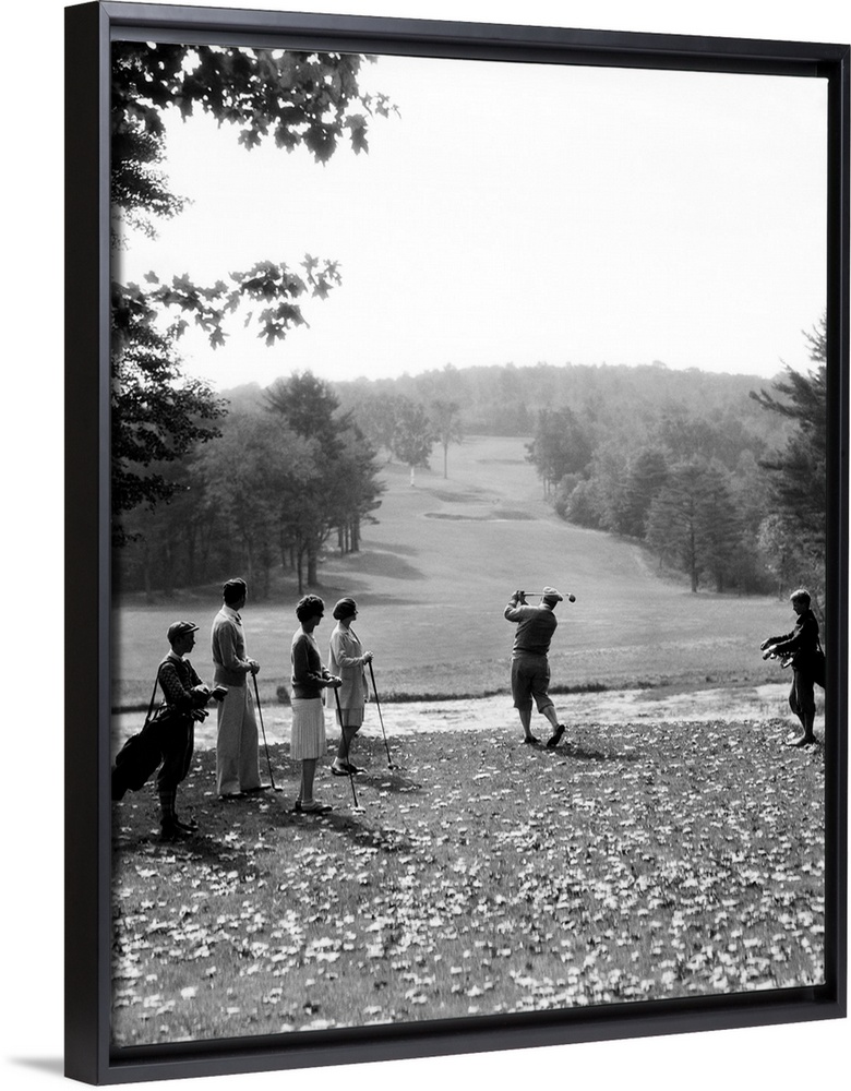 <p>1920s 1930s Group Of Golfers Teeing Off 2 Men 2 Women And 2 Caddies At The Country Club Pittsfield Berkshires Ma.</p>
