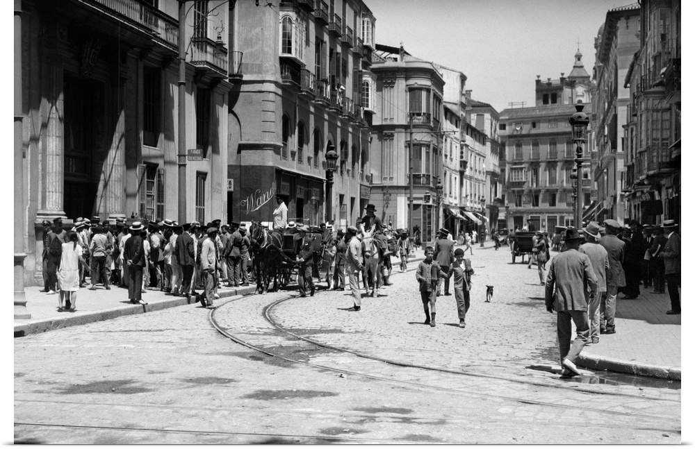<p>1920's 1930's Street Scene With Crowd In Front Of Hotel Regina Malaga Spain.</p>