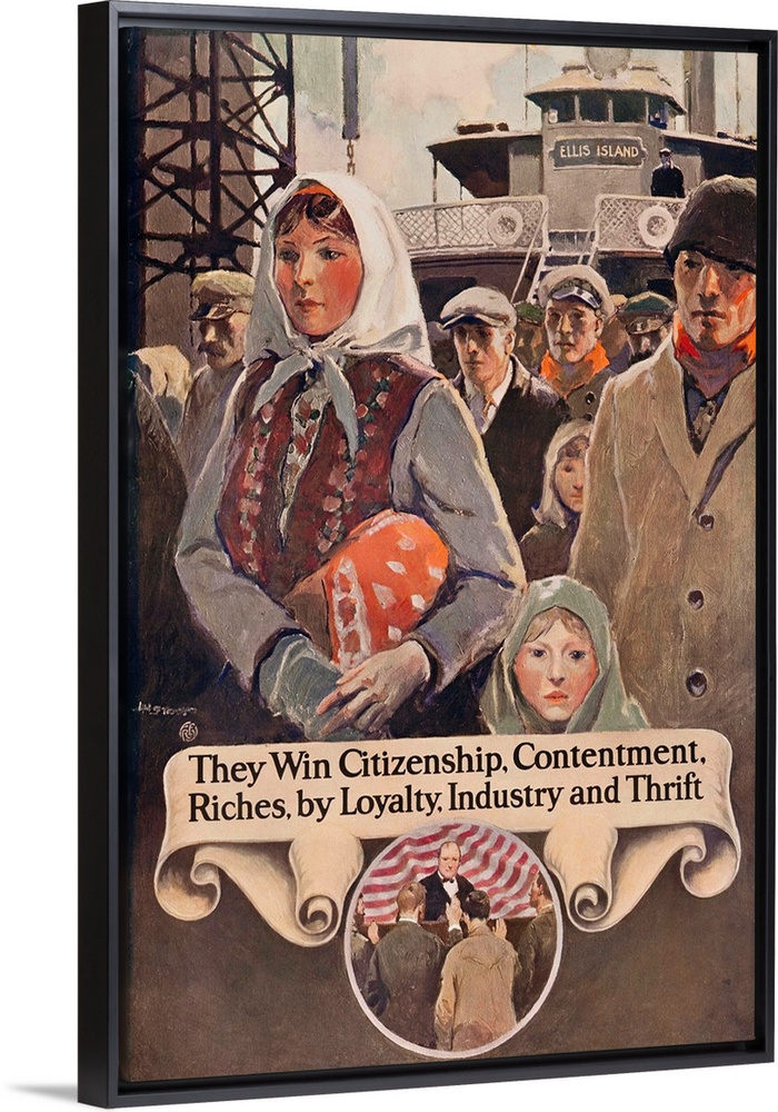 <p>Printed by National Service Bureau, Family disembarks from ship named Ellis Island arriving in the land of opportunity. They Win Citizenship, Contentment, Riches, by Loyalty, Industry and Thrift</p>