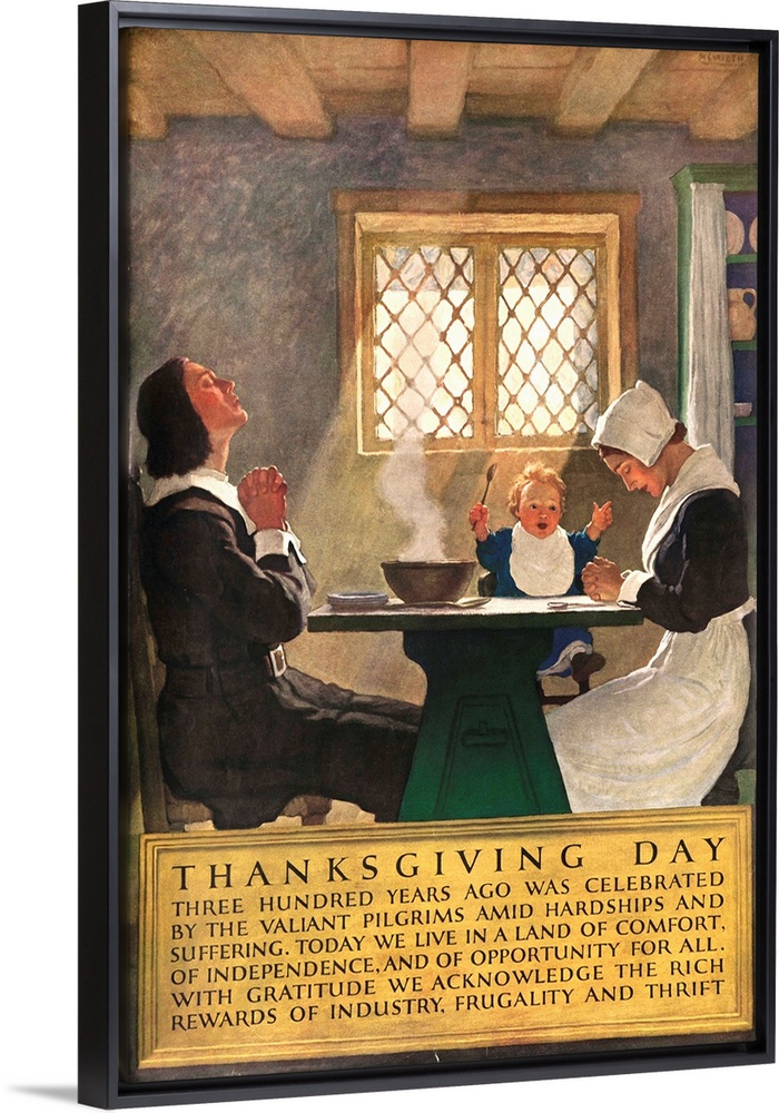 <p>Printed by National Service Bureau, Pilgrim family sit down to enjoy Thanksgiving meal, illustrated by NC Wyeth. ...With gratitude we acknowledge the rich rewards of industry, frugality and thrift.</p>