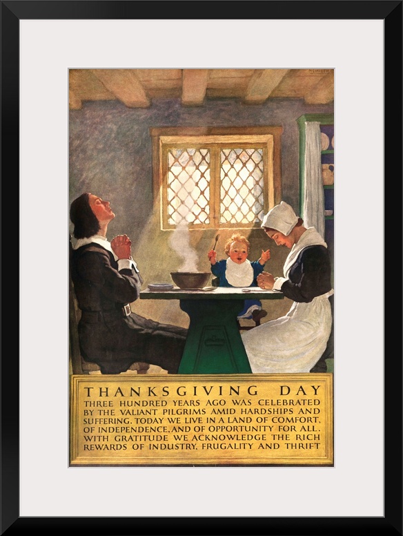 <p>Printed by National Service Bureau, Pilgrim family sit down to enjoy Thanksgiving meal, illustrated by NC Wyeth. ...With gratitude we acknowledge the rich rewards of industry, frugality and thrift.</p>