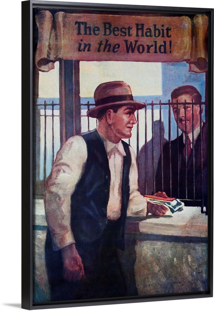 <p>Printed by National Service Bureau, Working man makes a deposit into his savings account.</p>