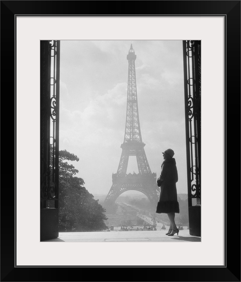 <p>1920's Anonymous Silhouetted Woman Standing In Profile In The Trocadero Across The Seine From The Eiffel Tower Paris France.</p>