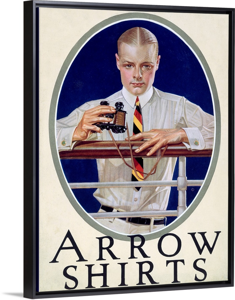 <p>This elegant advertisement by J.C. Leyendecker epitomizes the crisp, aspirational style that defined the Arrow Collar Man campaign. The image features a young, blond man in a perfectly pressed Arrow shirt and boldly striped tie, leaning casually against a ship's rail while holding binoculars. The nautical setting suggests leisure, travel, and modernity-hallmarks of early 20th-century American affluence. Leyendecker's signature attention to detail, luminous skin tones, and sophisticated masculine ideals helped cement Arrow as one of the most recognizable brands in men's fashion.</p>