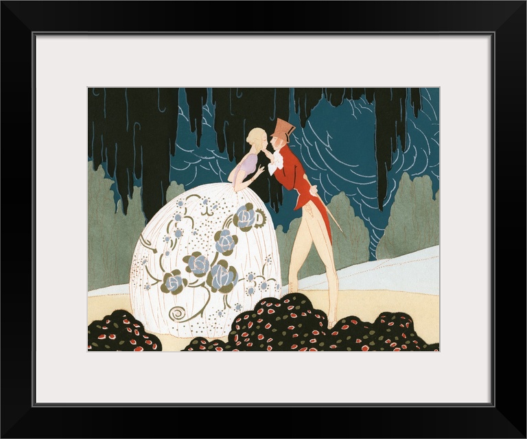 <p>1920s Art Deco Illustration Couple About To Kiss Woman Wearing White Silver Balloon Shaped Gown Skirt With Floral Motif.</p>