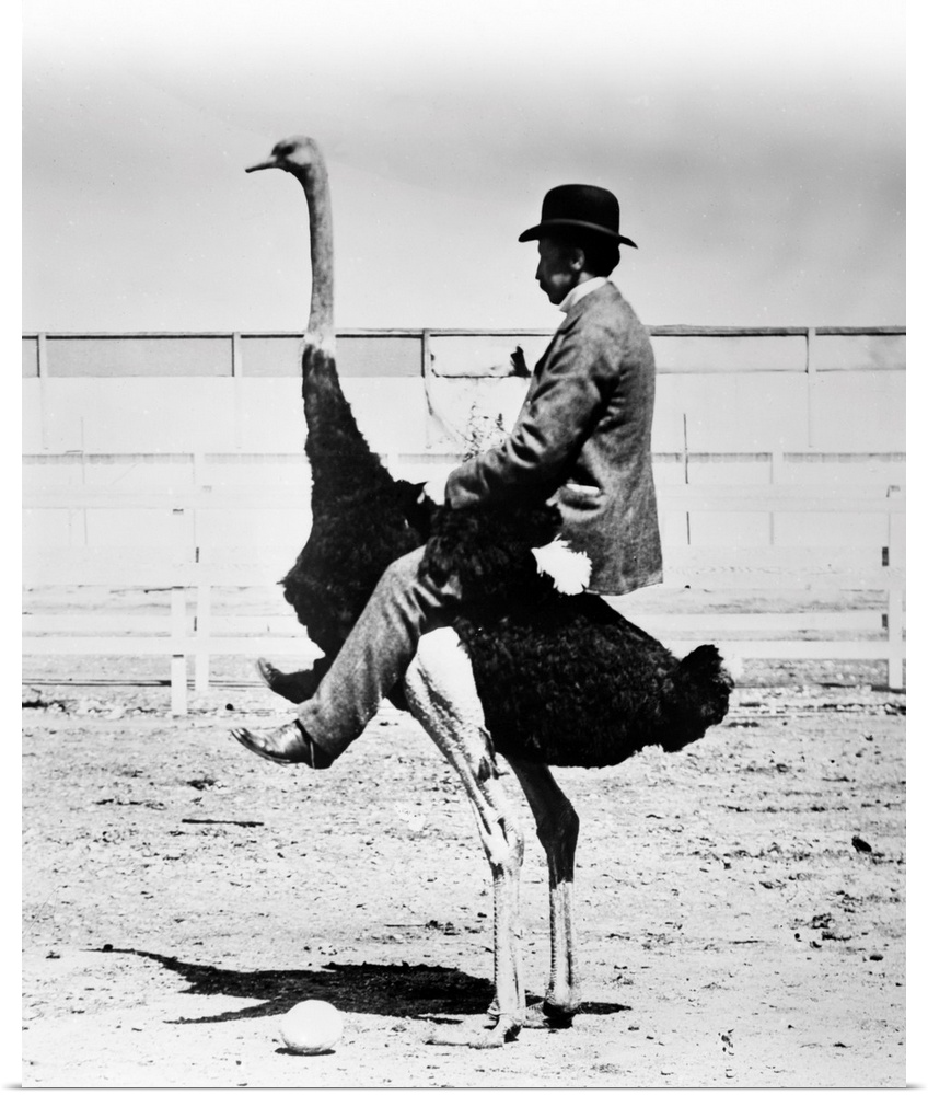 <p>1920s Man wearing bowler hat riding on back of ostrich.</p>