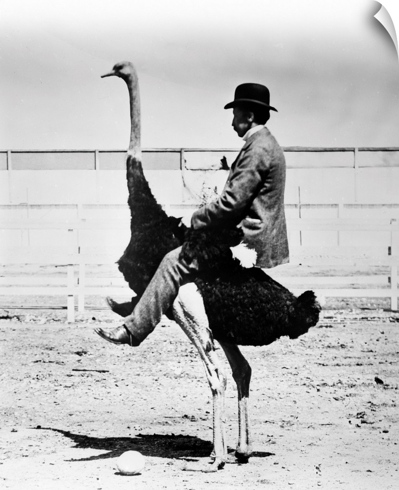 <p>1920s Man wearing bowler hat riding on back of ostrich.</p>