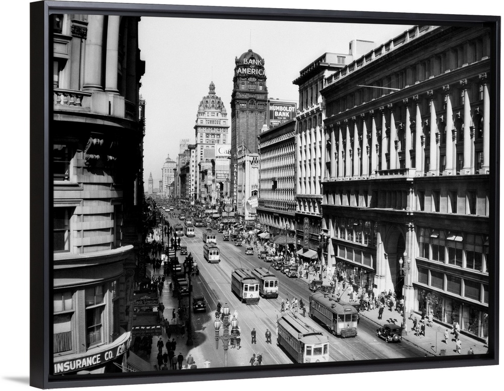 <p>1920's Market Street From Powell Looking Toward The Ferry Building Track For Cable Cars San Francisco California USA.</p>