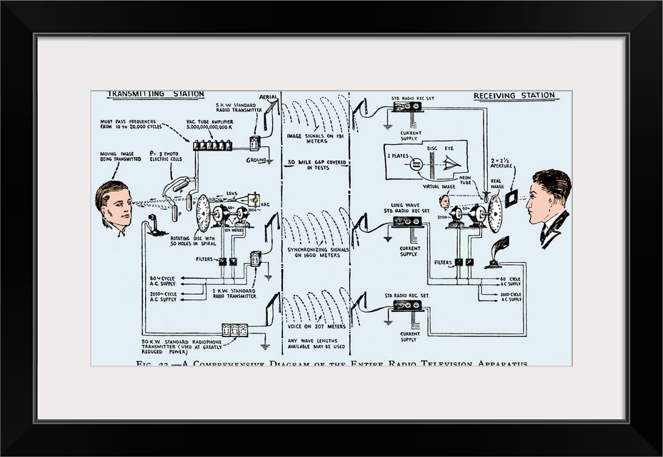<p>1920s television system, diagram. This is the television system used by the Scottish engineer John Logie Baird (1888-1946), and first demonstrated in 1926. The transmitting apparatus is at left, and the receiving apparatus is at right. The system used a rotating mechanical disk with 50 holes in a spiral to break up the picture into areas to record and transmit. The information was transmitted using radio waves. At the receiver, the information is used to build up the image, which is observed through the holes of another rotating disc. Diagram published in Television (Dinsdale, 1928).</p>
