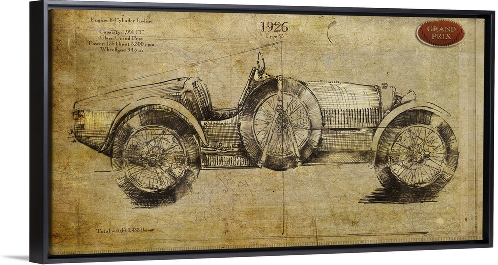 <p>Contemporary artwork of a vintage race car in profile. On a weathered and rustic background.</p>
