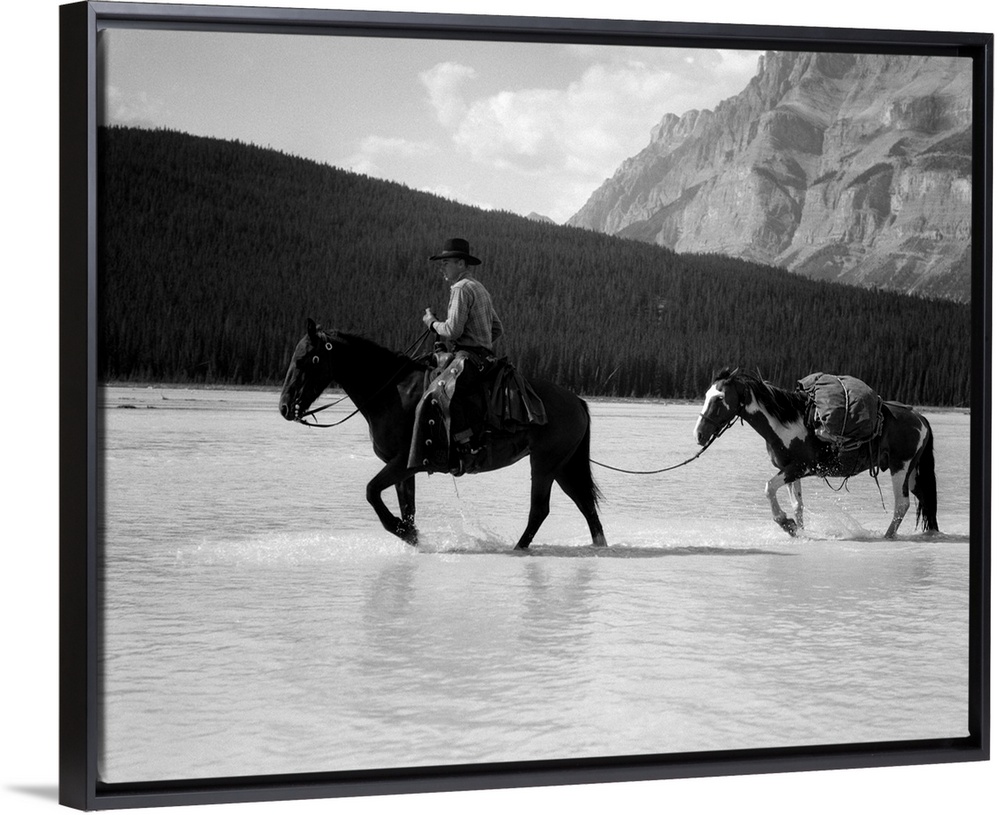 <p>1930s 1940s Cowboy On Horseback Crossing River With 2nd Horse In Tow.</p>