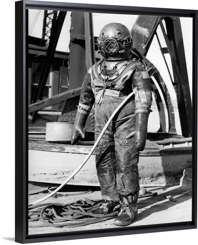 <p>1930s 1940s Full Figure Of Man In Underwater Hard Hat Deep Sea Diving Suit.</p>