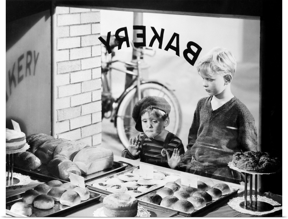 <p>1930s 1940s two boys looking in bakery shop window at desserts. One boy pressing hands and nose against window.</p>