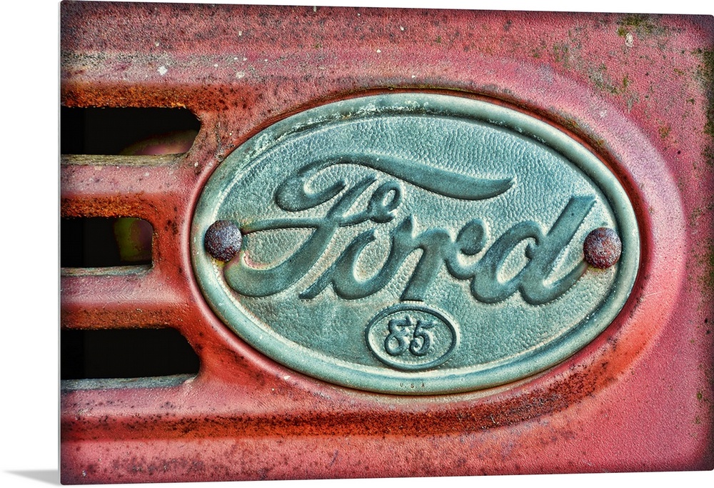 <p>Oversized, horizontal photograph of a Ford emblem attached to an old, rusty 1930's Ford F38.</p>