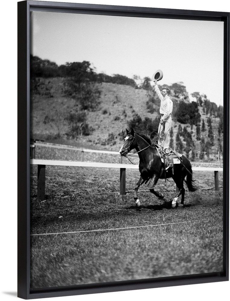 <p>1930s Jim Rogers Son Of Actor Will Rogers Performing Stunt Trick Standing On Galloping Horse Back Waving Cowboy Hat.</p>