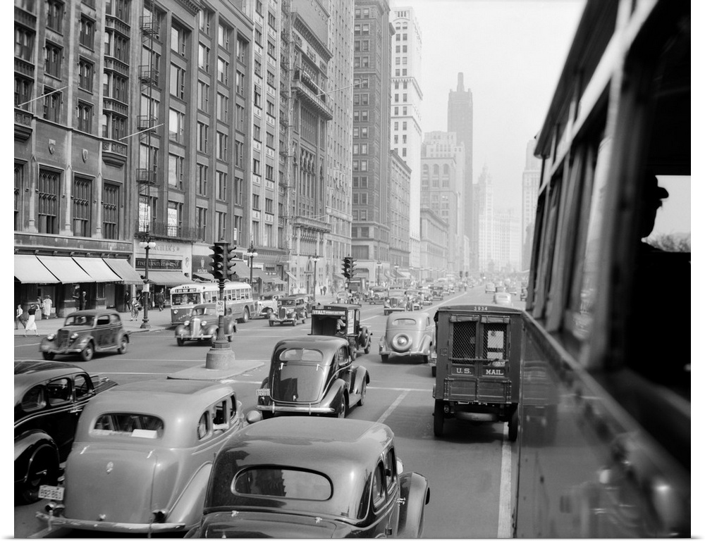 <p>1930's Morning Traffic On Michigan Avenue Chicago Illinois USA.</p>