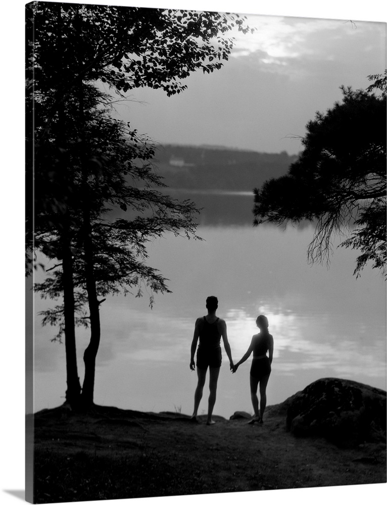 <p>1930s Rear View Anonymous Silhouetted Man And Woman In Bathing Suits Holding Hands Watching Sunset Lakeside.</p>