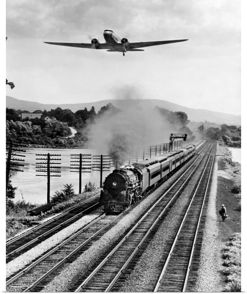 <p>1930s Three Forms Of Transportation Man Walking By Train Tracks 4 Mph Steam Engine Train 40 Mph Airplane Above 200 Mph.</p>