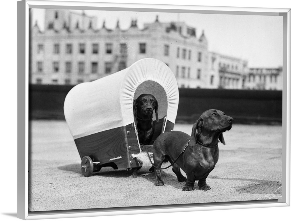 <p>1930s Two Dachshund Dogs One Pulling The Other In Small Covered Wagon.</p>